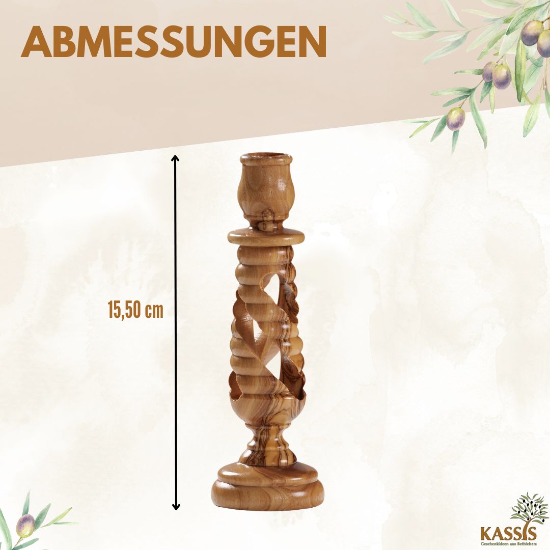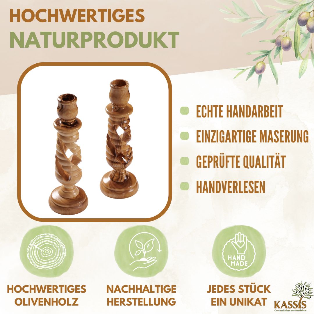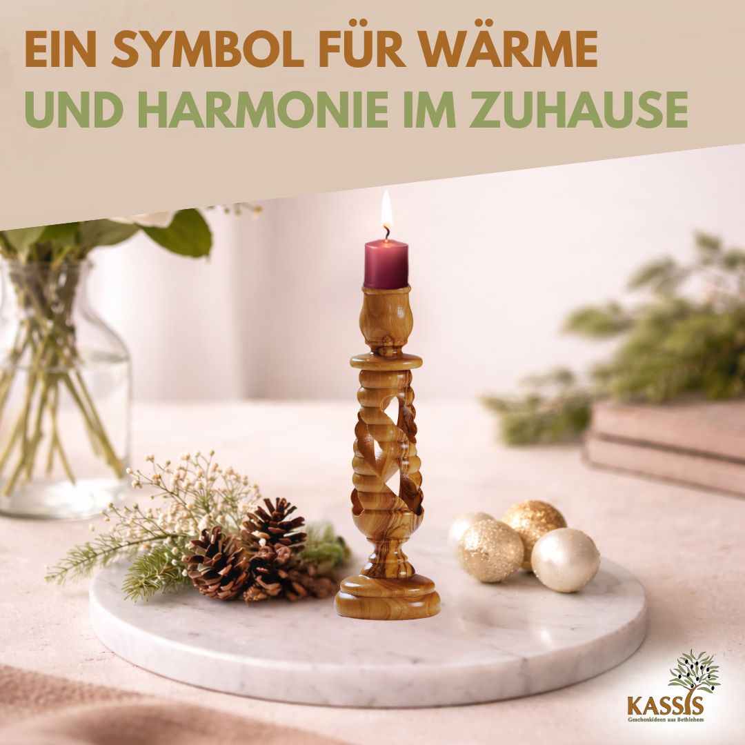 Dieser kunstvoll gedrechselte Kerzenständer wird in Bethlehem von erfahrenen Handwerkern aus hochwertigem Olivenholz gefertigt. Das spiralförmige Design verleiht ihm eine elegante Leichtigkeit, während die warme Maserung des Olivenholzes für Natürlichkeit und Harmonie sortiert.